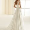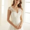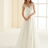 Trouwjurk van het merk Bianco Evento. De bruidsjurk Margaret heeft een prachtig kanten v hals bovenlijfje met een klein kapmouwtje. De jurk is gemaakt van prachtige soepelvallende chiffon, en heeft een klein sleepje. De jurk is verkrijgbaar in de maten XS tot en met 6XL. Prijsrange 600-999 euro.