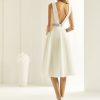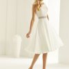 Korte Bruidsjurk van chiffon met kanten lijfje van het merk Bianco Evento. De Florida heeft prachtige super diep uitgesneden rug. De jurk is verkrijgbaar in de maten S tot en met 3XL.