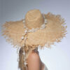 - Versierd met een hoedenband die bestaat uit ivoorkleurige kanten bloemen, ivoorkleurige stoffen bloemetjes met een ivoorkleurig pareltje en champagnekleurige blaadjes.