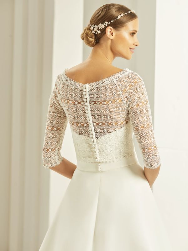Top van het merk Bianco Evento. Deze prachtige bolero top van boho kant heeft 3/4 mouwtjes en een mooi afgewerkte knoopjes sluiting op de rug. Verkrijgbaar in maat S tot en met 5XL.