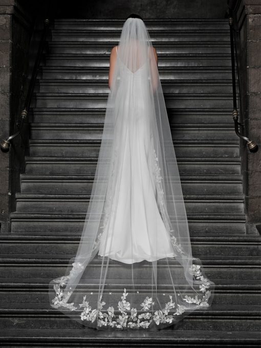 Enkellaags sluier van tule versierd met geborduurde bloemen in ivoor en zilverkleur versierd met pailletten. Lengte van de sluier is 300 cm.
