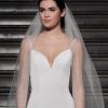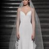 Enkellaags sluier met rand van een geborduurd bloemenmotief. Lengte 2.80 m of 3.50 m, gemeten vanaf de kam.