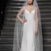 Enkel laags sluier van tule met geborduurde bloemmotieven met pailletten en een geschulpte rand van geborduurd kant met pailletten. Verkrijgbaar in ivoor tule/ivoor kant, peach tule/ ivoor kant en peach tule/peach kant. Lengte is 350 cm.