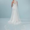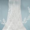 Zoek jij graag de romantiek op tijdens jouw grote dag, kies dan voor deze enkel laags ivoorkleurige soft-tule sluier uit de Randy Fenoli Collectie van Poirier. Deze sluier is prachtig versierd met kant vanaf 150 cm onder de kam. De sluier heeft ook geborduurd kant, 3D-bloemen en pailletten. Bevestig deze sluier in je kapsel, middels de kam die vastzit aan de sluier. De sluier heeft een lengte van 350 cm.