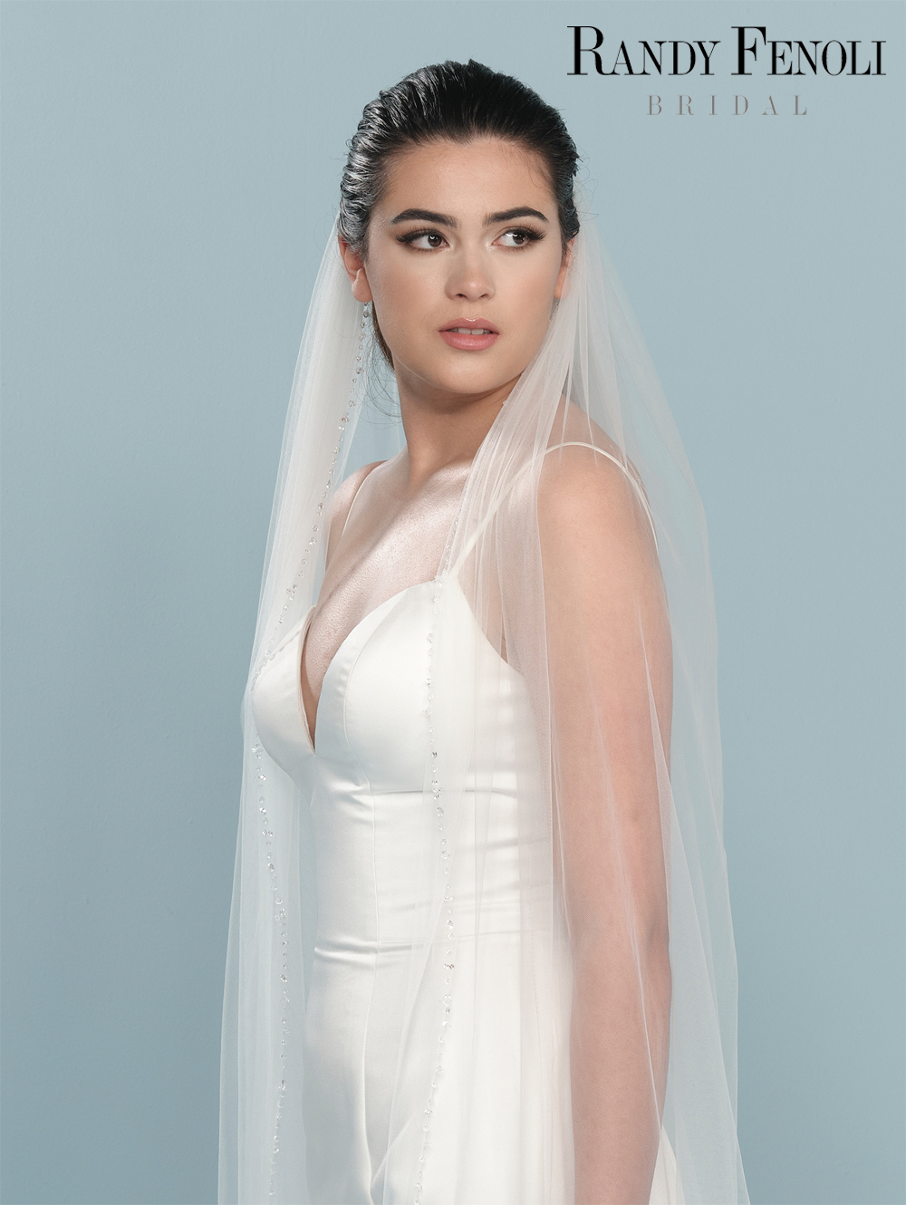 Schitterende sluier uit de collectie van Randy Fenoli van Say yes to the dress ! Deze enkel laags sluier heeft een fijn randje met hele mooie luxe kristallen, die geheel rondom op de sluier zijn gezet. De sluier is gemaakt van mooie soft tule en is 350 cm lang.