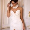 - Accentueert de gedrapeerde taillelijn met een split aan de voorkant.