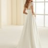 Trouwjurk Natalie van het merk Bianco Evento. De bruidsjurk Natalie heeft een prachtige V hals kanten lijfje met een klein kapmouwtje. De jurk is gemaakt van prachtige soepelvallende chiffon, en heeft een klein sleepje. De jurk is verkrijgbaar in de maten XS tot en met 5XL. Prijsrange is 600-999.