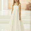 Bruidsmeisjes jurk van het merk Bianco Evento. De jurk kan natuurlijk ook voor de communie worden gedragen. Hij is gemaakt van een prachtige kwaliteit satijn met een overlaag van organza en een kanten lijfje. Deze jurken zijn ook makkelijk door ons op maat te maken, indien er een andere maat nodig zou zijn.
