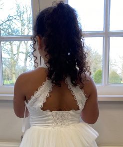 Bruidsmeisjes jurk van het merk Bianco Evento. De jurk kan natuurlijk ook voor de communie worden gedragen. Hij is gemaakt van een prachtige tulle en een kanten lijfje met mouwtjes. De rug is ook erg mooi; hij heeft een key-hole sluiting met knoopjes. Deze jurken zijn ook makkelijk door ons op maat te maken, indien er een andere maat nodig zou zijn.